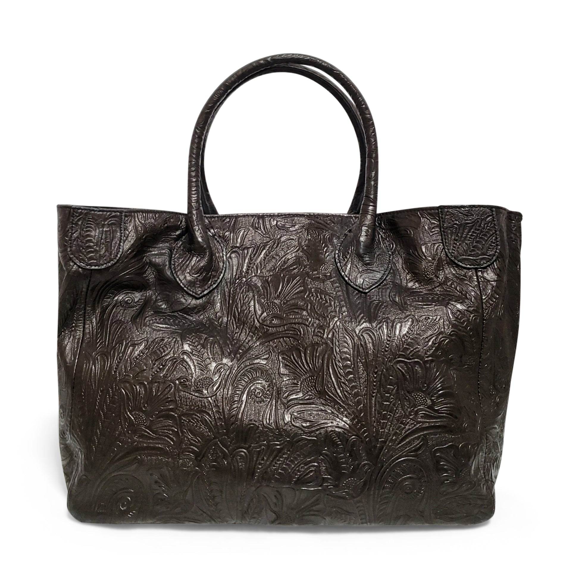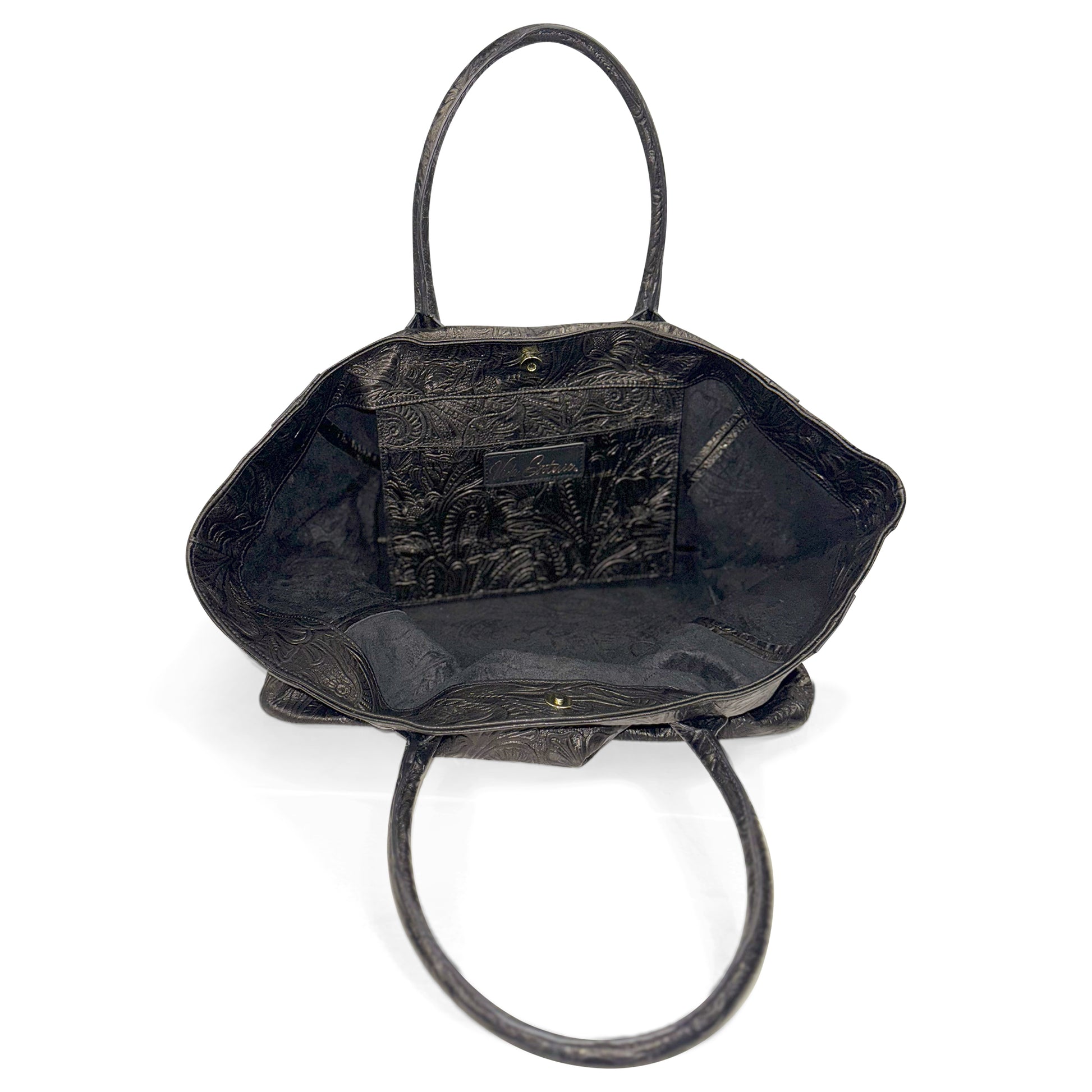Rendered in a deep, true black textured print leather. Elevated by its paisley-inspired surface, this colorway serves as the essential everyday expression of the tote that is timeless, versatile, and universally refined.